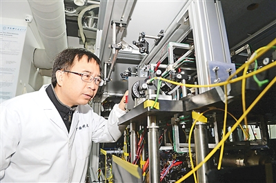 在中国科大量子存储实验室内,潘建伟在了解科研情况。
