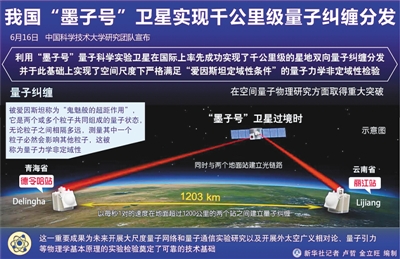 2016年8月16日,中国成功发射了世界首颗量子科学实验卫星“墨子号”,率先在国际上实现高速星地量子通信。“墨子号”的发射,使得中国率先实现了“千公里级”的星地双向量子纠缠分发,打破了此前国际上保持多年的“百公里级”纪录。这也为连接地面光纤量子通信网络、构建一个天地一体化的量子保密通信与科学实验体系打下基础。