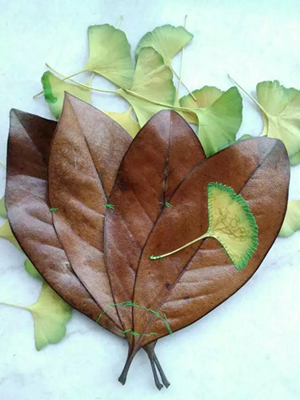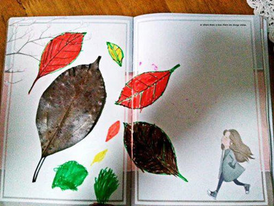 剩下的叶子,我鼓励性地对女儿说[想想看,还可以有什么玩法]。果然,在我忙着做其他事情的时间,她再次选取了一片叶子,将叶子贴在我送她的笔记本里,然后在这片叶子的周围,女儿绘出了不同的叶子,组成了一幅很美的画。等我做完家务,她给我讲她勾画的这幅画,那个路过的小女孩是她,她遇见这片落叶,然后带落叶回家,为这片叶子安了一个新的家,并且在周围绘画了不同的叶子陪伴它。我为她的创意和想象鼓掌。