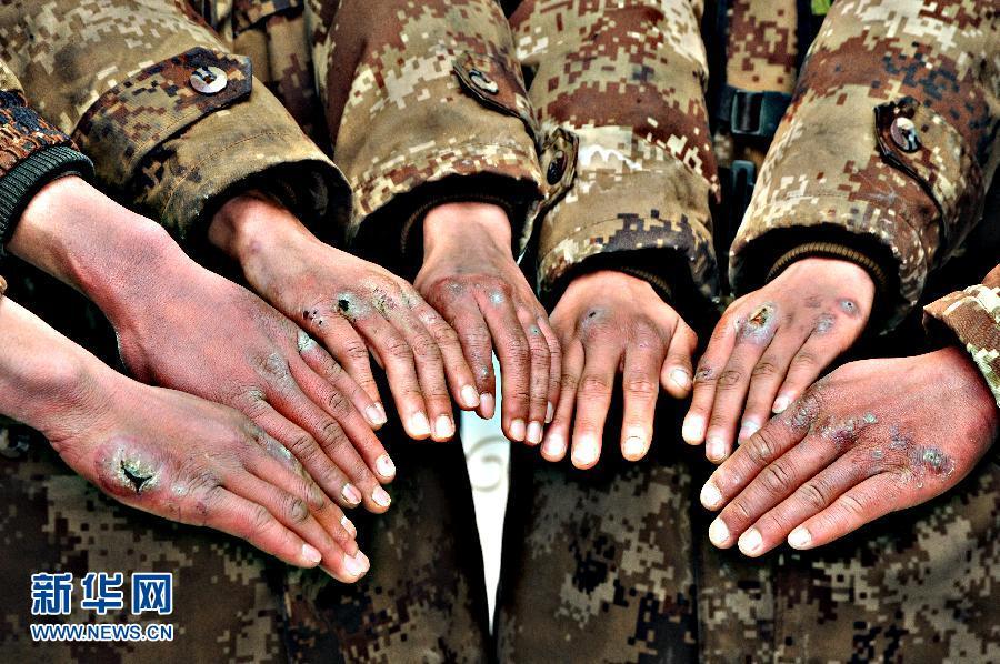 边防战士雪中训练,手上冻疮触目惊心(图片来源:新华网)