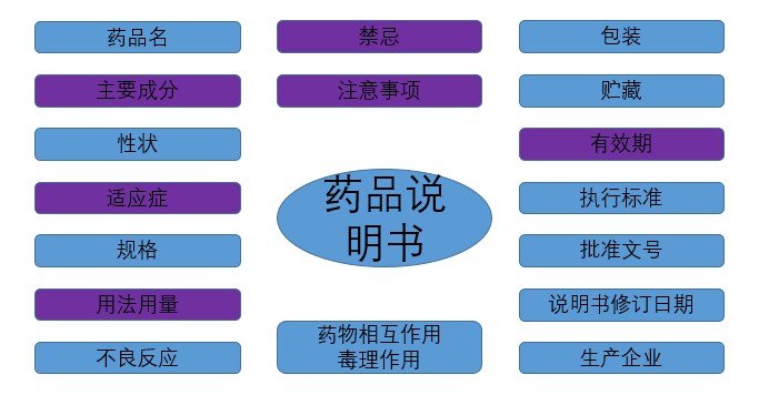 下图为药品说明书的内容(紫色为病人及病人家属应当主要关注的模块)