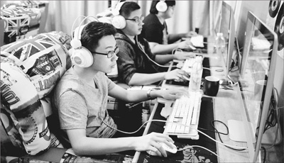网吧是青少年熬夜的主要场所之一。图为年轻人在山东青岛一家网吧上网玩游戏。