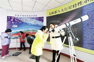 河北衡水科技知识普及进社区。图为11月27日,一个孩子在萃景社区科技馆内体验天文望远镜。