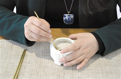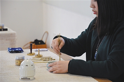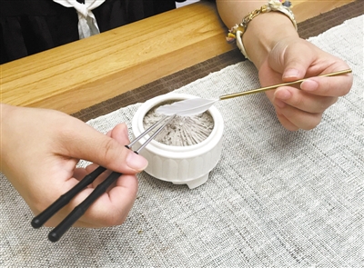 第二步:重复三次上面的动作,在整理香灰的过程中,保持安静并且不要发出工具触碰的噪音,用羽尘轻轻扫落沾在香筷上的香灰。