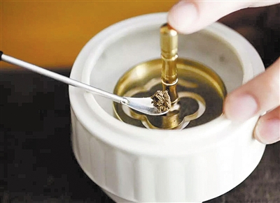 第四步:把香篆模子轻轻放在香炉正中间。用左手扶着香篆模子上端,用香勺取一点香粉,填在香篆空隙中,直到空隙填满,如果填完香粉后用香铲把多余的香粉推到一边,再用香勺把多余的香粉盛回瓶子里面。