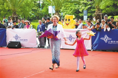 开幕式活动上,科技“大咖”们走出实验室,转场上海科技馆,玩转科学红毯秀,人气爆棚!鲜花掌声中,粉丝簇拥下,原本只属于明星们的红毯上,走来了一位位在科技道路上勇攀高峰的科学家和工程师们。英雄航天员聂海胜、中国工程院院士柴洪峰、中国科学院院士薛永祺、C919项目团队精英韩克岑、北斗导航“领航人”郁文贤教授……他们年龄不同、国籍相异,且来自各行各业。第一个走上红毯的是上海科技馆理事长、上海科普教育发展基金会理事长、复旦大学上海医学院教授左焕琛。陶氏化学亚太区首席科学家、美国化学会上海分会会长陈红宇、巴斯夫分散体及胶状材料研究全球高级副总裁Helmut Winterling等世界500强在沪研发机构负责人随后纷纷走上“科学红毯”。此外,未来科技之星,人气科普电视节目《少年爱迪生》优秀选手孟子鸣、魏泽源、王潘也玩转红毯。