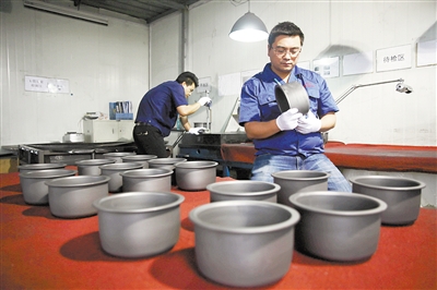 图为6月4日,在河南省宝丰县信瑞达石墨制造有限公司,技术人员在检测电饭锅内胆质量。新华社发(何五昌摄)