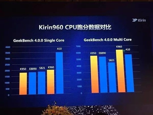从华为公布的数据来看,“麒麟960”的CPU和GPU(即图形处理器,又称显示芯片,是一种专门在个人电脑、游戏机和一些移动设备上负责图像运算工作的微处理器)性能超越“骁龙821”(2016年7月高通发布的最新旗舰处理器),虽然单核性能依旧弱于苹果A10(2016年9月苹果发布的首款四核处理器),但多核性能已经超越A10,与其在GPU性能上的差距也已大幅缩短。