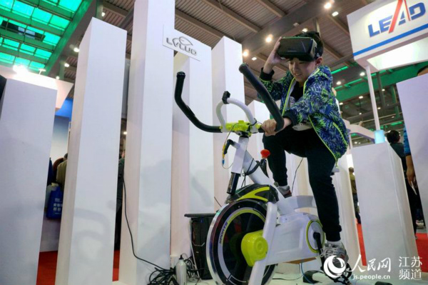 一款结合了VR技术的骑行健身器械,让参观者感到惊喜。孩子带上VR眼镜,眼前不再是室内的单调场景,而是模拟在大自然中骑行的体验,转动车龙头还能变化骑行线路。(图片来源:人民网江苏频道)