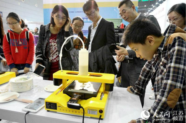 3D打印是物联网技术的常见应用。在2016世界物联网博览会上,高大上的新技术,以接地气的应用方式,拓展到食品加工领域。这款机器可以根据事先设定的图案,以事先调制好的面粉为材料,制作各种创意饼干。(图片来源:人民网江苏频道)