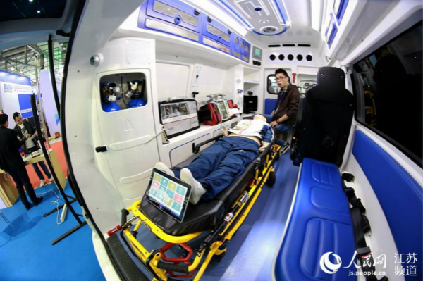 智慧救护车的外观与普通救护车并无不同,但内部结构充满科技感。通过物联网技术,救护人员可以及时掌握患者的各项生命体征数据,并能远程传输给医院,让急诊医生提前制定抢救方案,赢得宝贵的抢救时间。(图片来源:人民网江苏频道)