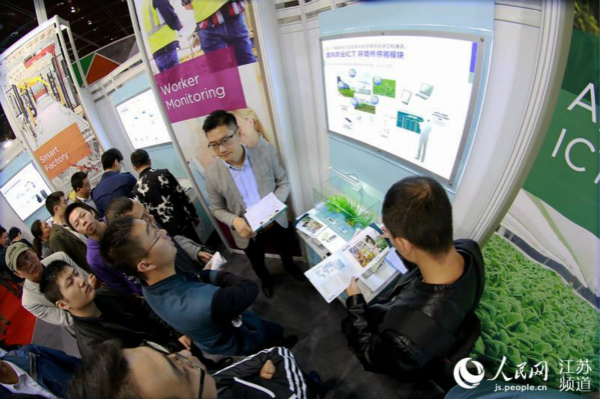 物联网技术应用到农业领域,极大提高了现代农业生产管理的效率。参展企业向观众展示,在无土栽培环境下,物联网传感设备可以密切监测气温、水温、湿度等情况,并通过系统化方式适时作出调整。(图片来源:人民网江苏频道)