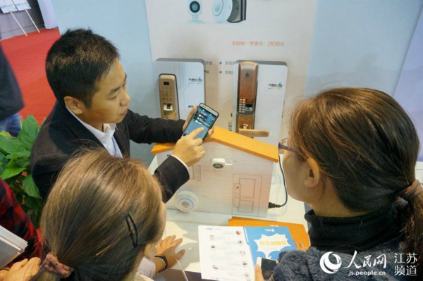 智能家居是物联网的热门应用领域,这款职能门庭系统,集合了指纹锁、摄像机、门铃等功能。可以指纹识别、门铃联动远程开锁,还能将老人、孩子设置为特定人群提醒,通过手机推送消息,掌握他们的回家信息。一款门锁集合多种功能,不少观众现场现场就想要订购。(图片来源:人民网江苏频道)