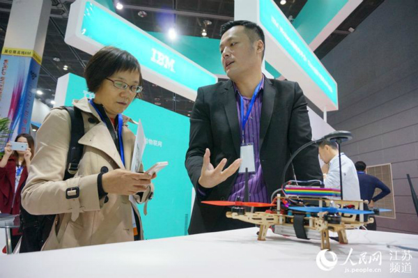 IBM公司展台,展示了一款传感器可以集合在无人机上的传感器,通过无线连接,可以实时查看气压、海拔、气温等情况。(图片来源:人民网江苏频道)