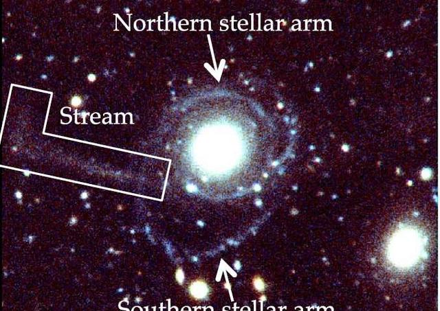 这是一个有着近一百亿太阳质量原子氢,在光学波段呈现相对无结构圆形的星系。该小组还使用央斯基甚大阵的射电深空观测来研究该天区的氢原子发射。他们发现,有一团低温气体成环状分布在这个直径约16万光年的星系周围,并且该星系的恒星形成效率非常低,仅约银河系的十分之一。研究还发现,这个环形结构与一个复合物质流相连。