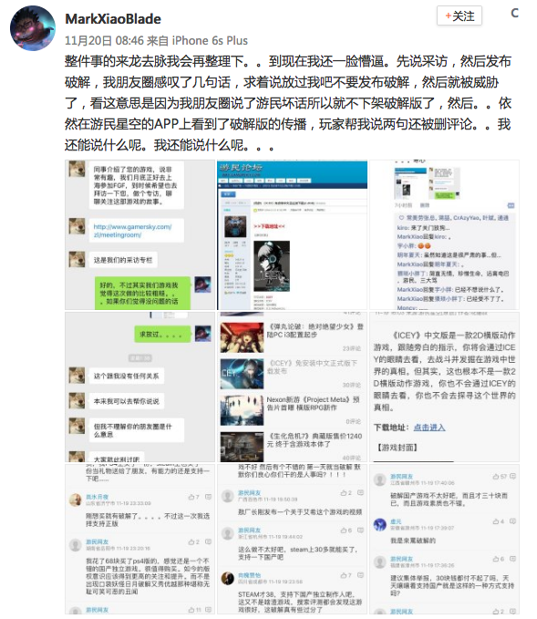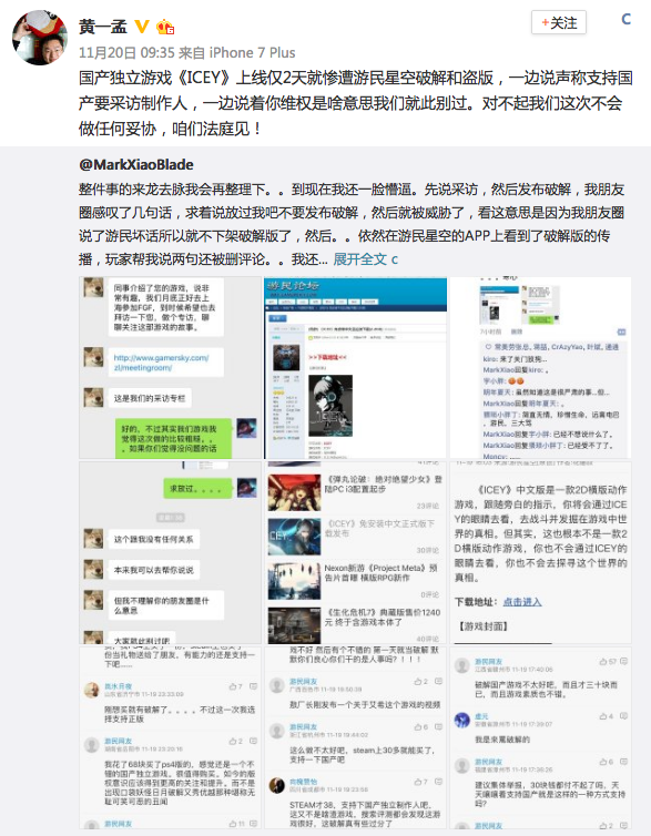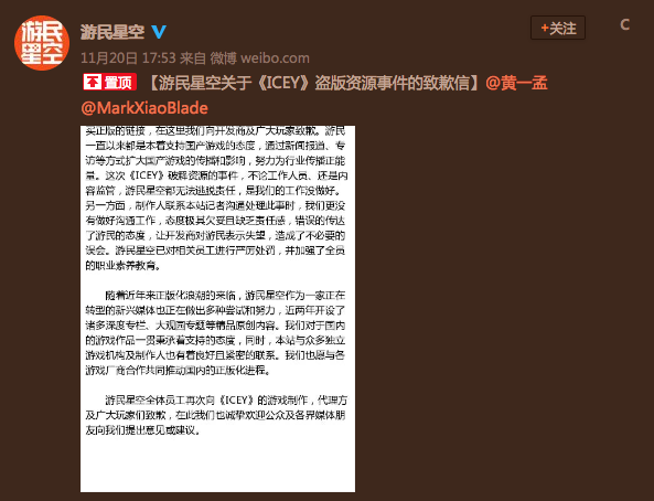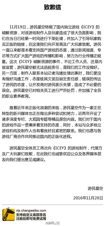 20日下午,游民星空官方微博发布《关于《ICEY》盗版资源事件的致歉信》,并于当日撤下了破解游戏的下载页面。