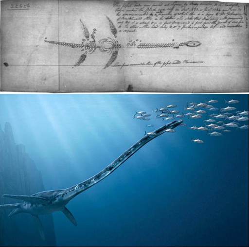 上图:玛丽安宁画的蛇颈龙草图 ,下图:蛇颈龙复原图(网络图)