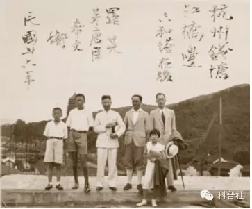 茅以升(左 3)和他的主要助手罗英(左 4)在杭州钱塘江桥边,竺可桢摄于 1936 年 7 月 19 日。
