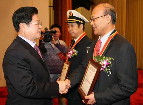 中共中央政治局委员、全国人大常委会副委员长王兆国为“十佳全国优秀科技工作者”获奖者颁奖