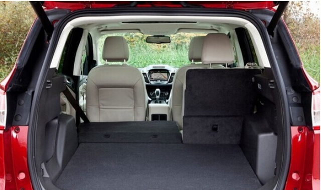 接下来,钻进后备箱,如果是身材比较高大的车主,可以在后窗玻璃下方附近找到双排椅背解锁键,并用双脚将后排座椅完全放倒。