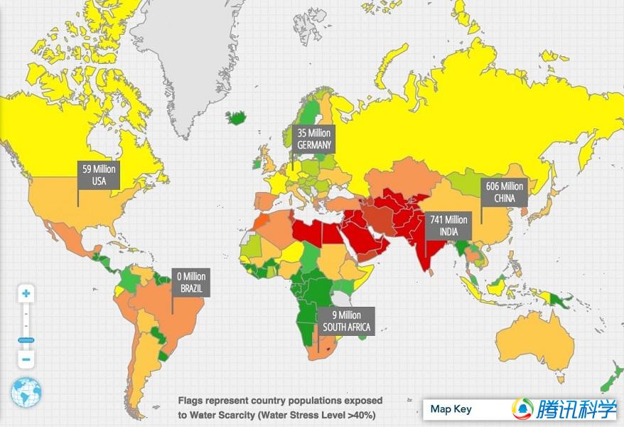 世界半数以上人口将无法得到充足的水源:现在全世界有11亿人口缺水,有25亿人(占世界总人口的36%)生活在用水紧张地区。到2050年,这一数字很可能增加。麻省理工学院的研究人员称,到2050年全世界97亿人口中将有50亿遭遇用水困难。目前全世界三分之一的河流正在消失或者已经消失,随着人口的增长和气候的变暖,这种形式将愈加艰难。