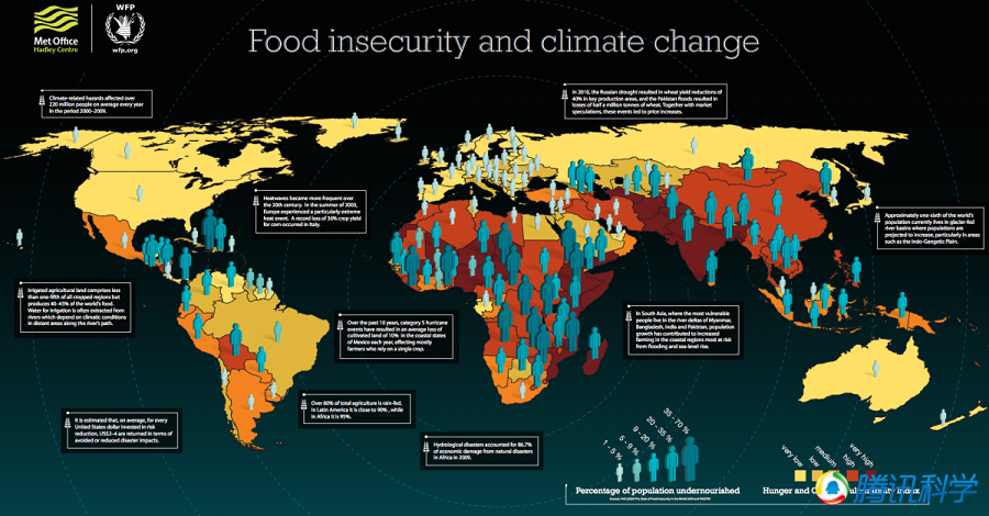 数百万人可能缺乏食物:随着地球的升温,我们能够生产的全球粮食总量将减少约2%,也就是大约444万吨粮食。农作物病虫害和病原体会传递到那些更温暖、更干燥的地区。全球的小麦、玉米和小米产量将下降,研究人员预计这些作物的产量到2050年将下降约10%。