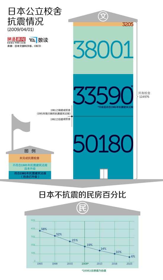 不抗震的建筑物是地震灾害中的主要杀手。据经济合作与发展组织统计,每年有约6万人死于地震,其中90%的遇难者来自发展中国家,且大部分死于建筑物倒塌。日本作为一个地震频发的发达国家,在建筑防震方面走在世界的前列,尤其是公立校舍。日本文部科学省2009年的调查显示,67%的公立校舍符合1981年的建筑抗震法规的要求。 严格的建筑法规保证日本的建筑质量 日本校舍的另一项功能是地震后的避难所,所以校舍的质量受到了严格的监控,因而被民众视为最坚固的建筑。日本在1971年施行了71年版抗震建筑法规,10年后的1981年对其进行了修订,又施行了81年版。这意味着,凡是1981年以后竣工的建筑都必须符合81年法规的要求,不符合的就需要进行升级。2009年文部科学省的统计显示,67%的公立校舍符合1981年的建筑抗震法规的要求,其余的部分符合1971年建筑抗震法规的要求。 1981年抗震建筑法规的作用在1995年阪神大地震中体现了出来。在此次地震中,相比于1981年之前竣工的建筑,1981年后竣工的建筑倒塌的概率要远低于前者。而造成人员死伤最惨重的建筑全部建成于1971年之前。阪神大地震之后,日本还加强了对民房的抗震能力的监管。从图上可以看出,1995年后不具备抗震能力的民房在逐年减少。 发展中国家建筑质量堪忧 90%的地震死难者来自发展中国家,这与这些国家的建筑质量低不无关系。一个国家的建筑质量一方面与该国的建筑设计法规不完善有关;另一方面,建筑领域的腐败也在影响建筑质量。反腐败组织透明国际的研究就显示,在所有行业中,建筑业的腐败是最严重的,尤其是在清廉程度低的国家。2001年印度古吉拉特邦地震后,就爆出了建筑丑闻。建筑商们通过贿赂的方式免掉了建筑质量的现场检查,最终37人被捕。相似的事情还发生在2002年伊朗布印扎哈拉地震和2003年伊朗巴姆地震之后。 抗震建筑可挽救更多生命 在2011年9.0级的日本3/11地震中,除去失踪和溺死,有1573人死亡;而震级较低(7.9级)的汶川地震中有69227人死亡。尽管影响地震死亡人数的的因素有很多(如人口稠密度、地面受到的实际破坏等),但如果不考虑海啸因素,两者相差超过40倍,这就不能否认建筑质量对地震损失的影响。类似的比较还有:1988年亚美尼亚地震共死亡25000人,而释放能量是其两倍的1989年旧金山地震中只有100人死亡。 |
